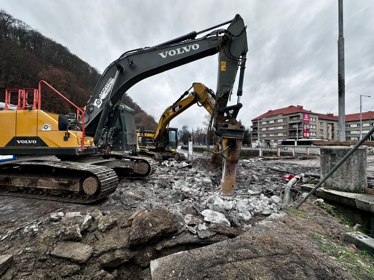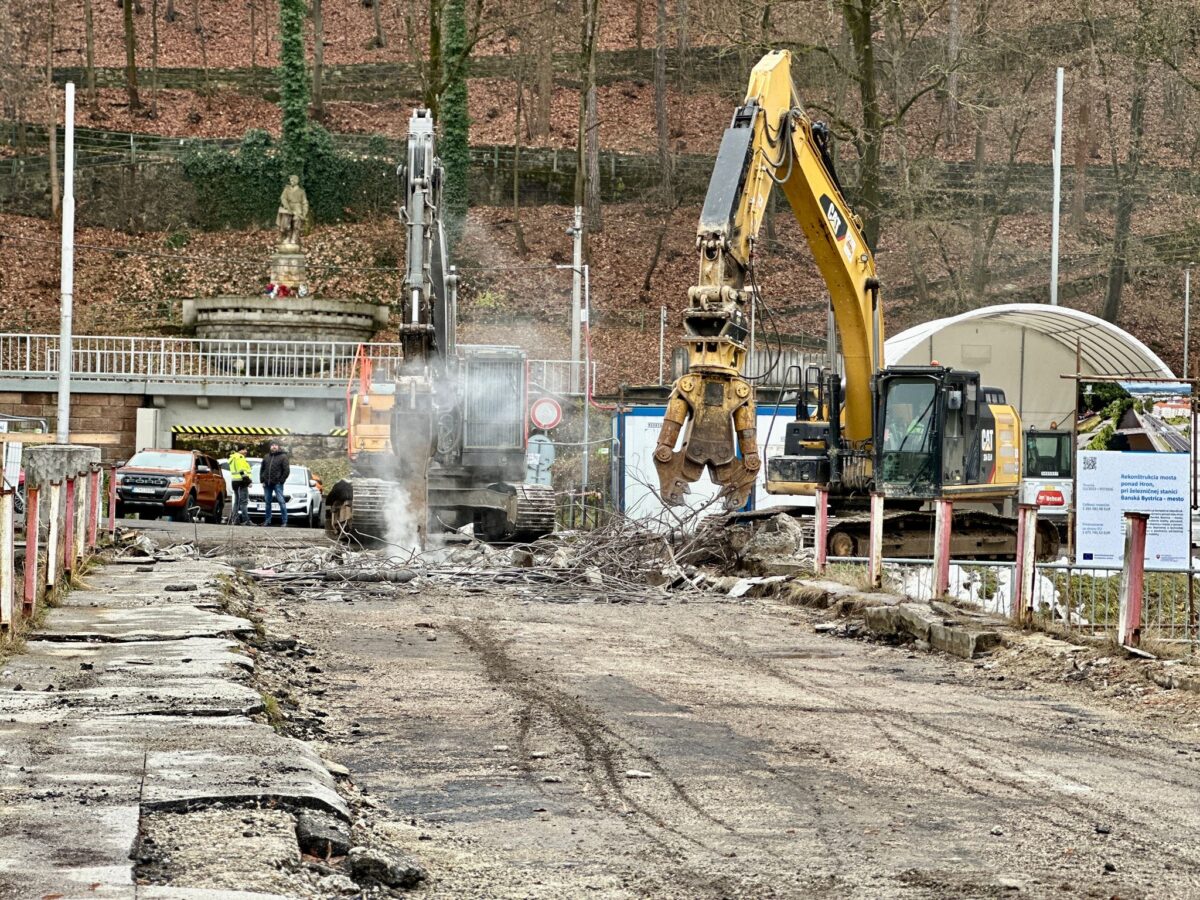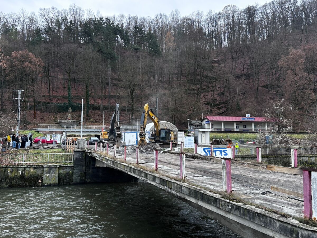 Práce na moste pri malej železničnej stanici po prekládke kábla vysokého napätia pokračujú búracími prácami