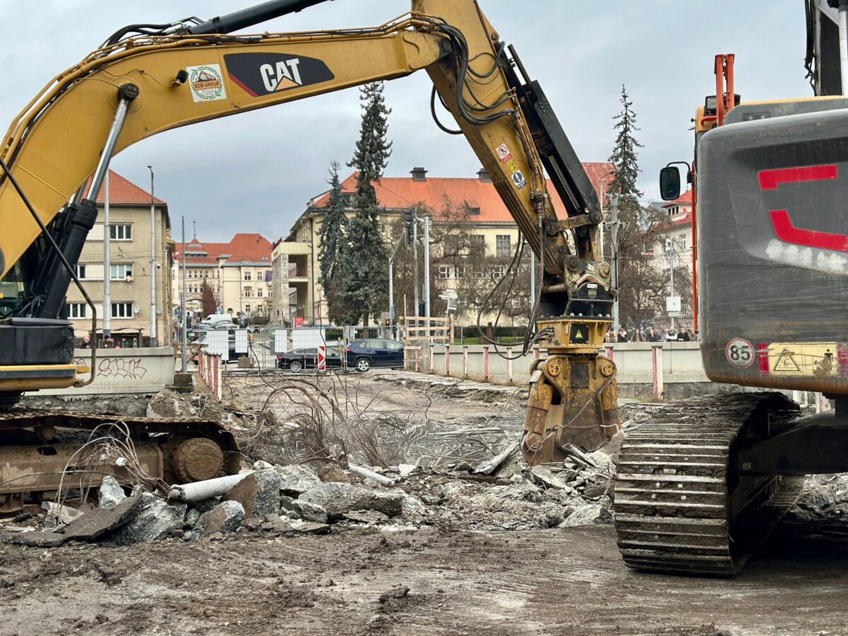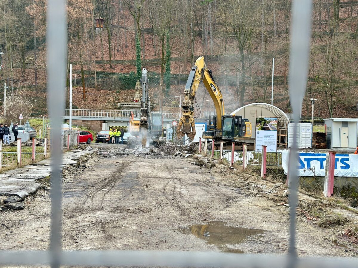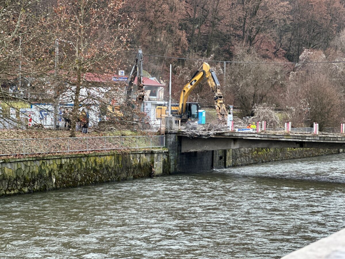 Práce na moste pri malej železničnej stanici po prekládke kábla vysokého napätia pokračujú búracími prácami
