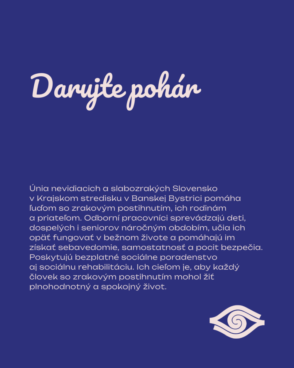 „Sme úprimne radi, že v rámci tohtoročných vianočných trhov si mesto dalo za cieľ pomôcť práve nám. Výťažok by sme chceli využiť na realizáciu aktivít, ktoré umožnia ľuďom so zrakovým znevýhodnením aktivizovať sa a vzdelávať sa v rôznych oblastiach. Plánujeme zorganizovať kurz sebaobrany a workshopy zamerané na oblasť finančnej gramotnosti, rozpoznania podvodov, hoaxov či konšpirácií. Financie využijeme aj na zakúpenie zdravotníckych a kompenzačných pomôcok – nových optických a elektronických lúp, bielych slepeckých palíc, ktoré sa budú používať v poradenskom procese pre vhodný výber pomôcok a v rehabilitačnom procese na nácvik práce s týmito pomôckami, aby ich ľudia so zrakovým postihnutím dokázali efektívne používať,“ dopĺňa Dagmar Filadelfiová, metodička pre sociálne služby, vedúca Krajského strediska v Banskej Bystrici.