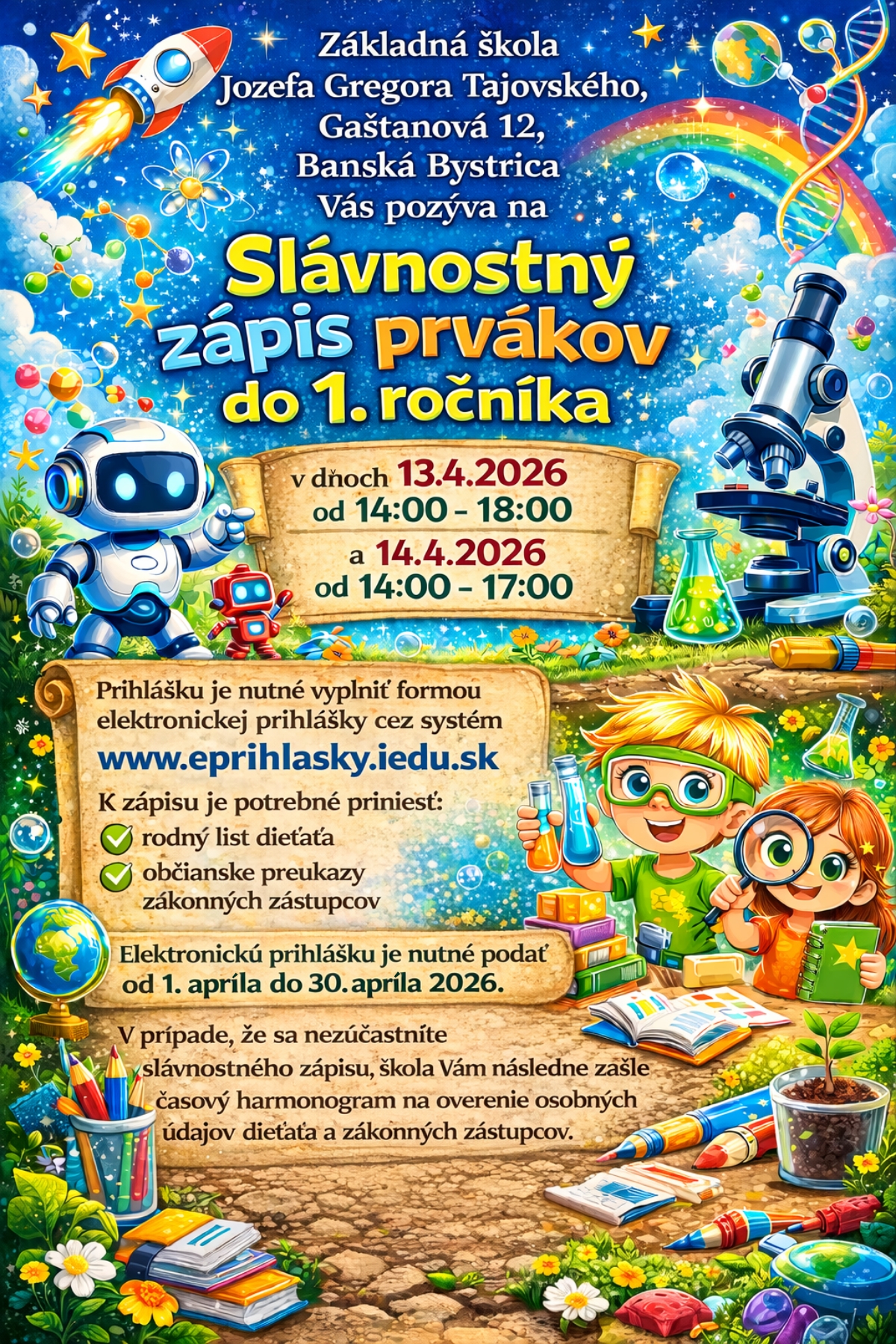 - ZŠ J. G. Tajovského, Gaštanová 12 – 13. 4. 2026 od 14:00 – 18:00 hod. a 14. 4. 2026 od 14:00 – 17:00 hod.