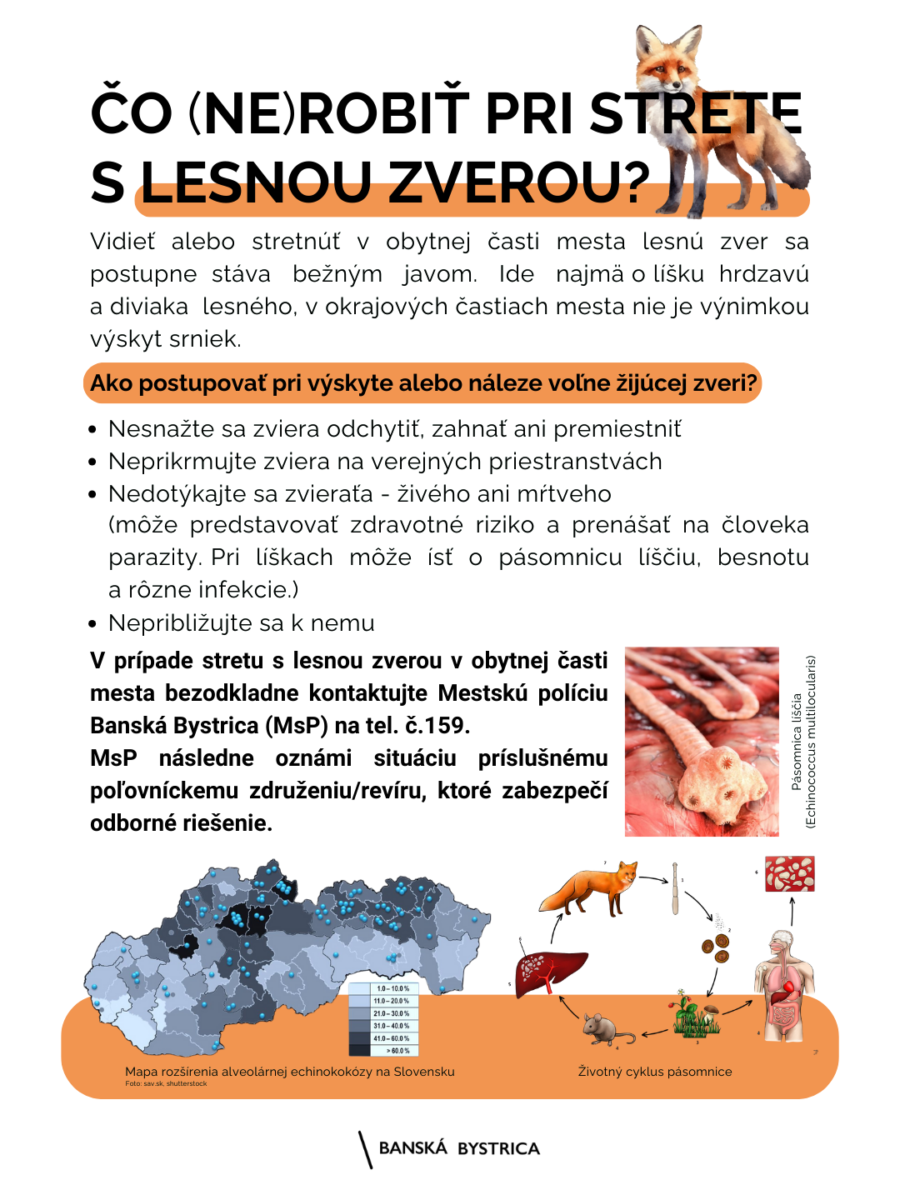 „Aktuálne evidujeme viacero podnetov týkajúcich sa zvýšeného výskytu líšok na sídlisku Sásová. Obyvateľov žiadame o zodpovedný prístup a spoluprácu, pretože len spoločným úsilím je možné minimalizovať riziká a zaistiť bezpečnosť. V prípade spozorovania lesnej zveri v intraviláne mesta je potrebné túto skutočnosť nahlásiť na stálu službu mestskej polície na telefónnom čísle 159 a uviesť približnú lokalitu, kde bola líška alebo iné zviera naposledy videné. Mestská polícia bezodkladne informuje zástupcu príslušného užívateľa poľovného revíru, ktorý prijme potrebné opatrenia na odchyt, odlov, resp. obmedzenie výskytu tejto zveri. Týmto spôsobom bola v uplynulých týždňoch odchytená jedna líška v Sásovej. Včasné nahlásenie výskytu umožňuje rýchle a bezpečné riešenie situácie, ochranu zdravia obyvateľov a zákonný postup v súlade s platnou legislatívou,“ objasňuje Andrej Huťka, z Oddelenia odpadového hospodárstva a údržby verejných priestranstiev MsÚ v Banskej Bystrici.