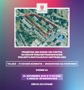 V auguste 2018 sme obyvateľom Fončordy predstavili návrh revitalizácie vnútrobloku Tulská – Kyjevské námestie – Moskovská. Odznelo niekoľko pripomienok, ktoré sme sa usilovali zapracovať. Vo štvrtok, 29. novembra 2018 o 17:00 hod. sa v jedálni ZŠ Moskovská uskutoční druhé verejné prerokovanie, na ktoré všetkých srdečne pozývame.