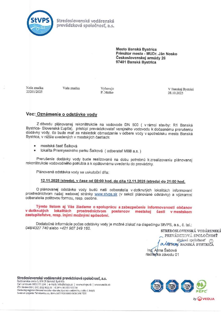 Z dôvodu plánovanej rekonštrukcie na vodovode DN 500 (v rámci stavby: R1 Banská Bystrica – Slovenská Ľupča), pristúpi prevádzkovateľ verejného vodovodu k dočasnému prerušeniu dodávky vody, čo bude mať za následok obmedzenie v odbere vody v spotrebisku mesta Banská Bystrica v nižšie uvedených častiach:
