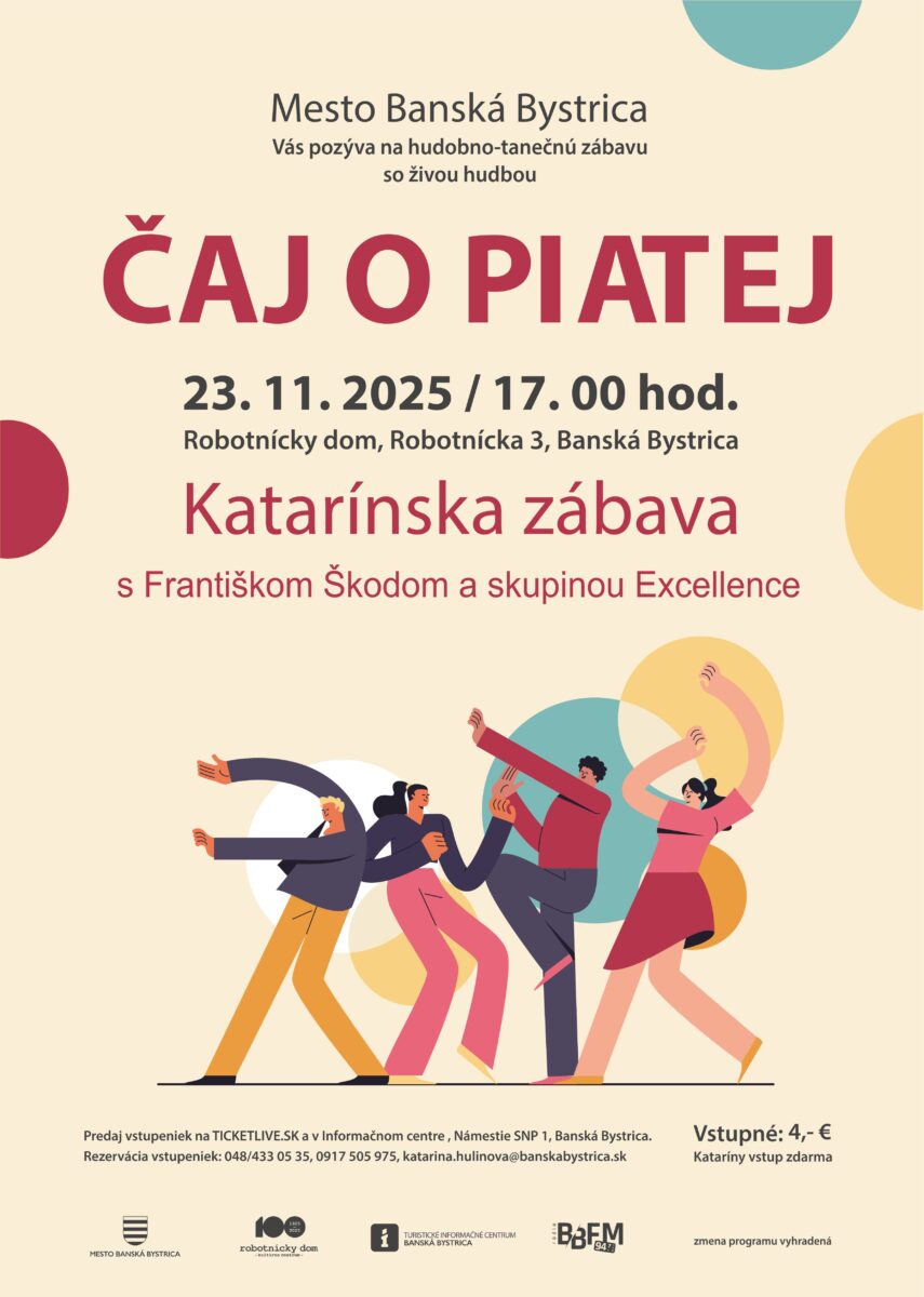 Mesto Banská Bystrica Vás pozýva na obľúbenú hudobno-tanečnú zábavu Čaj o piatej, ktorá je tentokrát venovaná všetkým Katarínam a uskutoční sa v nedeľu 23. novembra v Robotníckom dome. O zábavu sa postará František Škoda so skupinou Excellence.