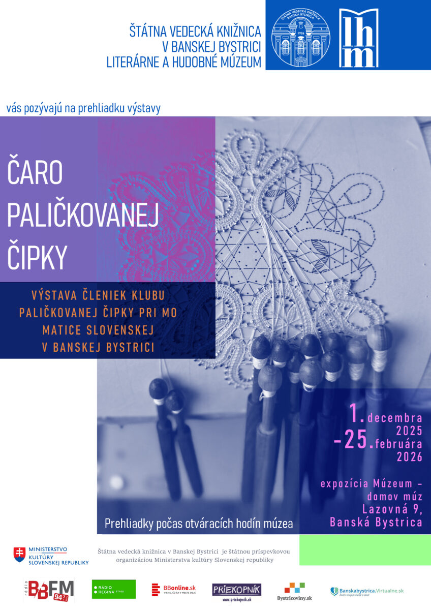 Štátna vedecká knižnica v Banskej Bystrici – Literárne a hudobné múzeum vás pozývajú na prehliadku výstavy ČARO PALIČKOVANEJ ČIPKY – výstava členiek Klubu paličkovanej čipky pri MO Matice slovenskej v Banskej Bystrici.
