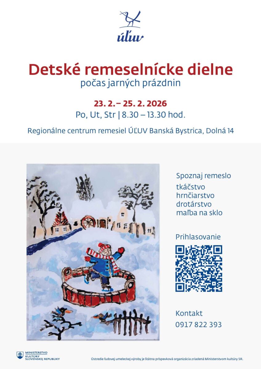 Prihláste vaše ratolesti na DETSKÉ REMESELNÍCKE DIELNE v Regionálnom centre remesiel ÚĽUV Banská Bystrica . Počas troch prázdninových dní budú môcť spoznávať rôzne remeselné techniky pod vedením skúsených lektorov. Okrem zážitkov a skúseností si z jarných prázdnin odnesú aj jedinečné remeselné drobnosti zhotovené ich vlastnými rukami.
