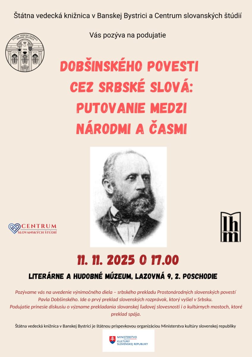 Pozývame vás na uvedenie výnimočného diela – srbského prekladu Prostonárodných slovenských povestí Pavla Dobšinského. Ide o prvý preklad slovenských rozprávok, ktorý vyšiel v Srbsku. Podujatie prinesie diskusiu o význame prekladania slovanskej ľudovej slovesnosti i o kultúrnych mostoch, ktoré preklad spája.