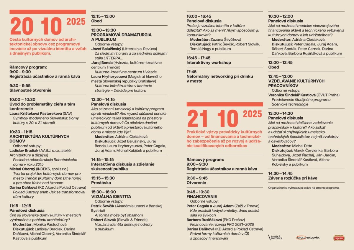 - deň: Praktické výzvy prevádzky kultúrnych domov – od financovania a technického zabezpečenia až po rozvoj a udržanie kvalifikovaných odborníkov.