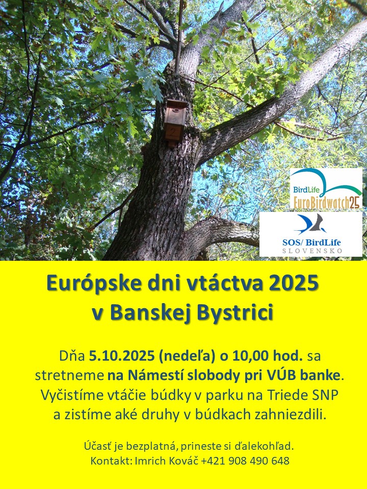 Pozývame na Európske dni vtáctva 2025 v Banskej Bystrici, ktorú organizujú členovia Banskobystrickej pobočky SOS/BirdLife Slovensko.