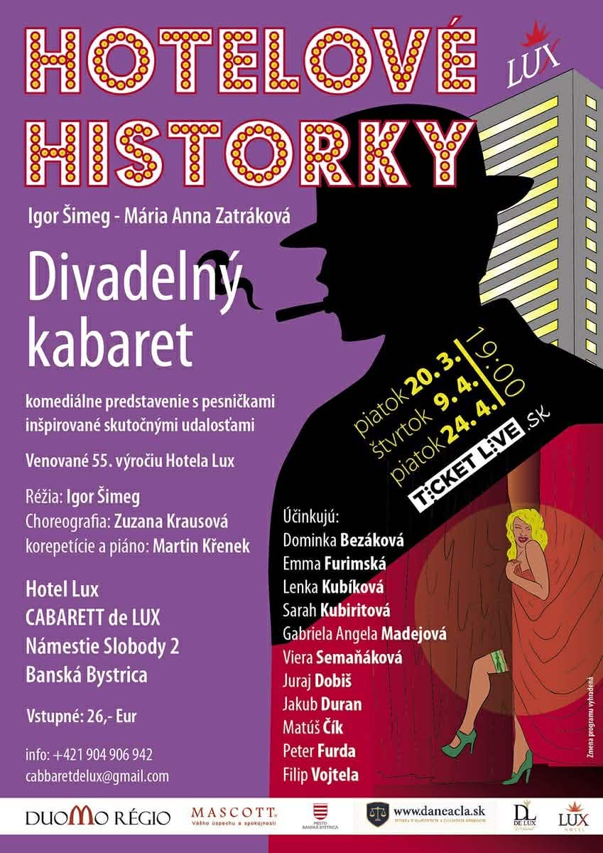Nový kultúrny počin v srdci Banskej Bystrice, kde sa história mieša s každodenným životom. Divadelný kabaret Hotelové historky, autorský projekt renomovaného herca, speváka a režiséra Igora Šimega a mladej autorky, dramaturgičky Márie Anny Zatrákovej, prináša na javisko autentické príbehy z minulosti Hotela LUX. Inscenácia plná humoru, hudby a tanca inšpirovaná skutočnými udalosťami ikonického hotela stredoslovenskej metropoly od roku 1970 spája s vtipom niekoľko generácií. Verejno-prospešný je projekt určený pre dospelých divákov od 21 rokov. Hotelové historky nielen odkrývajú históriu, tiež inšpirujú k reflexii nad spoločenskými zmenami aj umeleckým dedičstvom regiónu.