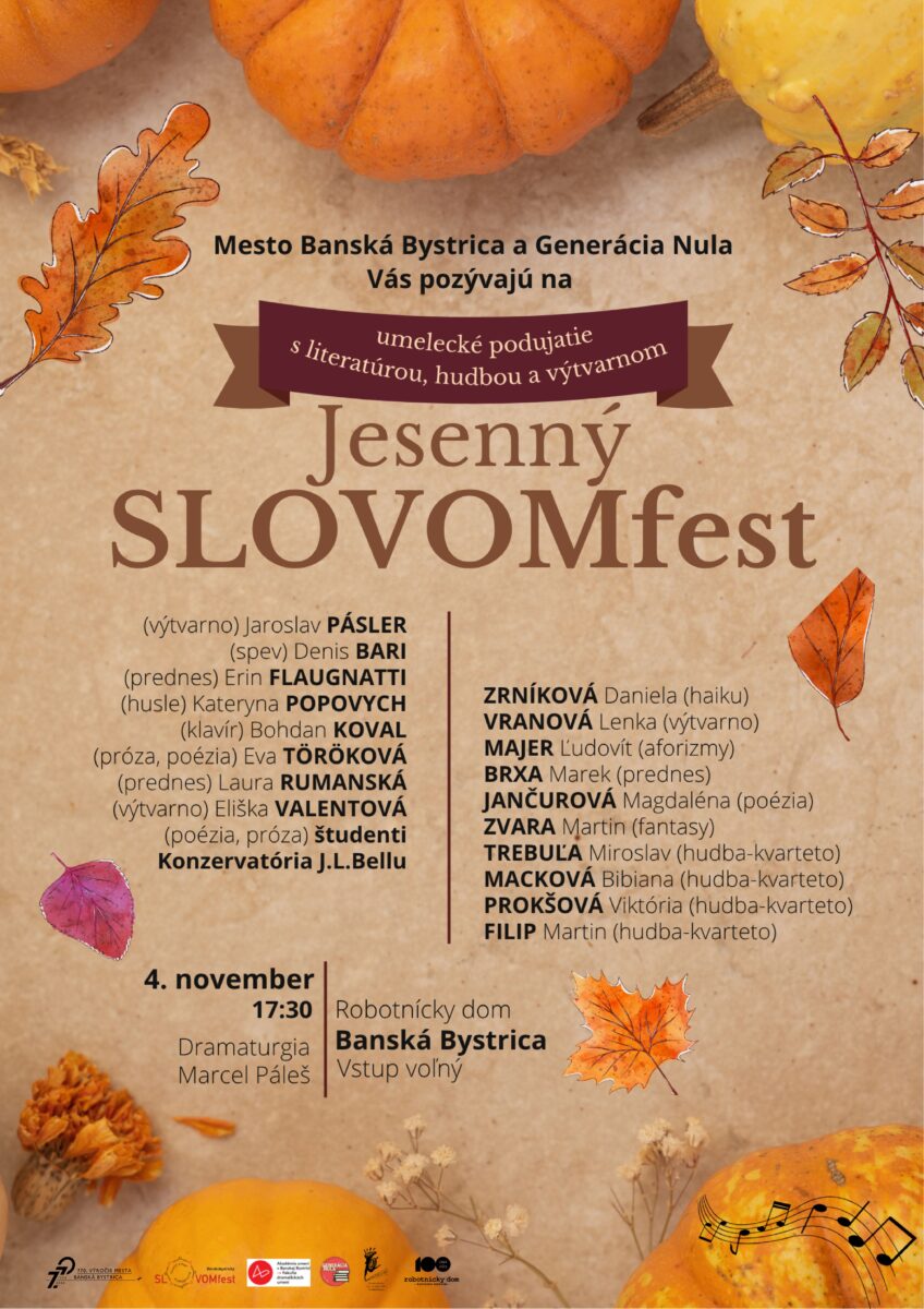 Mesto Banská Bystrica a Generácia Nula vás pozývajú na Jesenný SLOVOMfest, multižánrové hudobno-slovné podujatie s literatúrou, hudbou, výtvarným umením a rozhovormi o slove. Pripravený je pestrý program so zaujímavými umelcami. Vstup na podujatie je voľný.