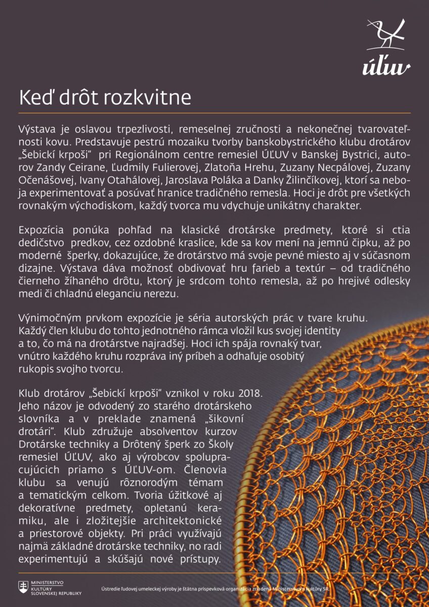Regionálne centrum remesiel ÚĽUV Banská Bystrica a klub drotárov „Šebickí krpoši“ vás pozývajú na výstavu s názvom „Keď drôt rozkvitne“.