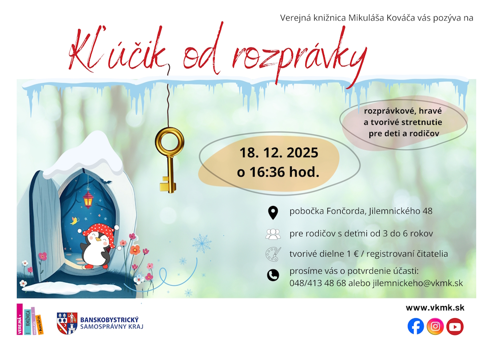 Verejná knižnica Mikuláša Kováča vás pozýva na Kľúčik od rozprávky – rozprávkové, hravé a tvorivé stretnutie pre deti a rodičov 18. 12. 2025 o 16:36 hod.: