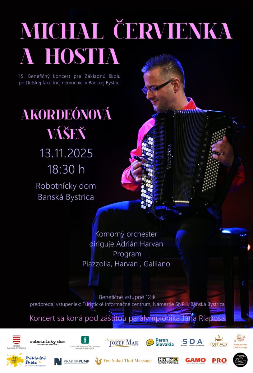 Srdečne pozývame na v poradí už 15. benefičný koncert Michala Červienku, venovaný Základnej škole pri Detskej fakultnej nemocnici s poliklinikou v Banskej Bystrici.