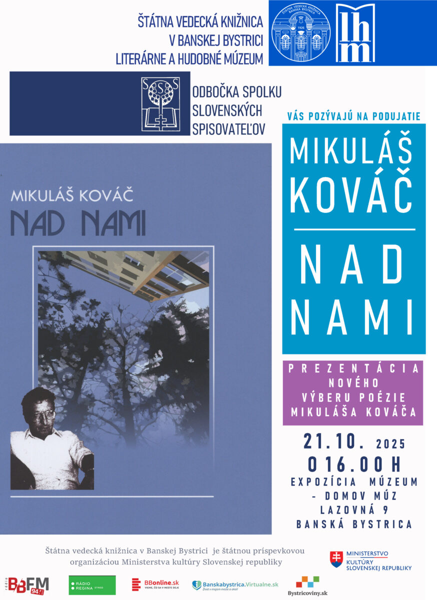 Štátna vedecká knižnica v Banskej Bystrici Literárne a hudobné múzeum a Odbočka spolku slovenských spisovateľov Vás pozývajú na prezentáciu nového výberu poézie Mikuláš Kováč: Nad nami.