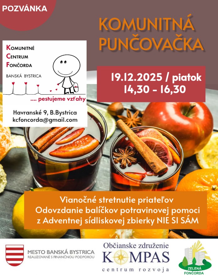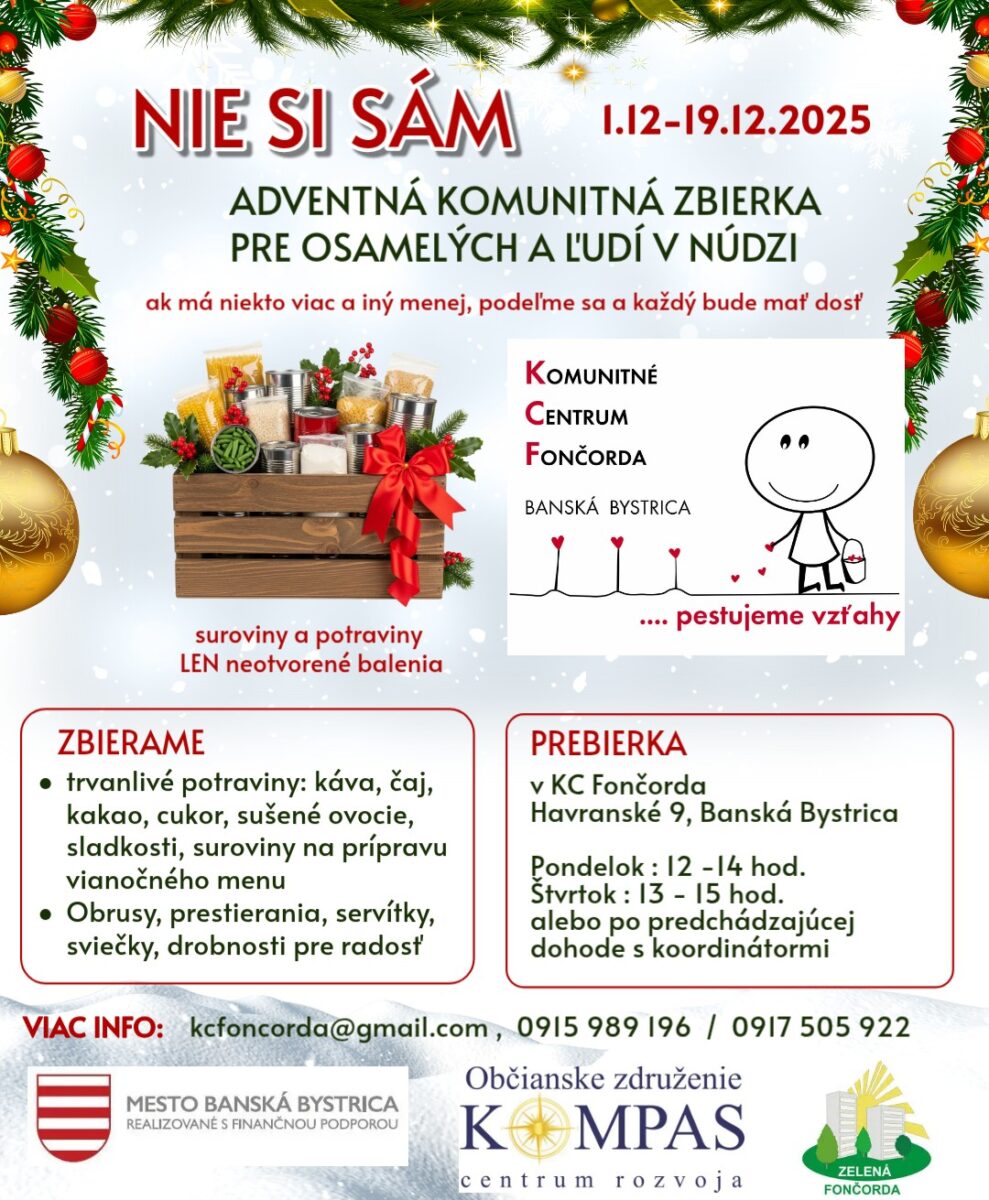 V období od 1.12.2025 do 19.12.2025 prebieha v KC Fončorda, Havranské 9, Banská Bystrica adventná komunitná zbierka pre osamelých a ľudí v núdzi s názvom „NIE SI SÁM“, kde sa v pondelok od 12:00 h do 14:00 h a vo štvrtok od 13:00 h do 15:00 h môžete podeliť a balíček odovzdať koordinátorom komunitného centra.