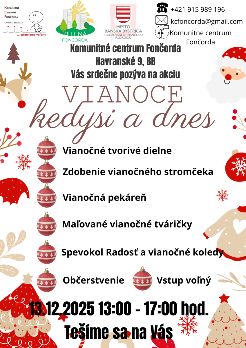 Zároveň vás v sobotu 13.12.2025 v čase od 13:00 h do 17:00 h pozývame na podujatie „Vianoce kedysi a dnes“. Predvianočný čas môžete stráviť pri zdobení vianočného stromčeka, v tvorivých dielňach s vianočnou tematikou, tváričky sa rozsvietia vianočným maľovaním. Vianočné pečenie vám spríjemnia koledy v podaní Spevokolu Radosť. Vstup voľný.