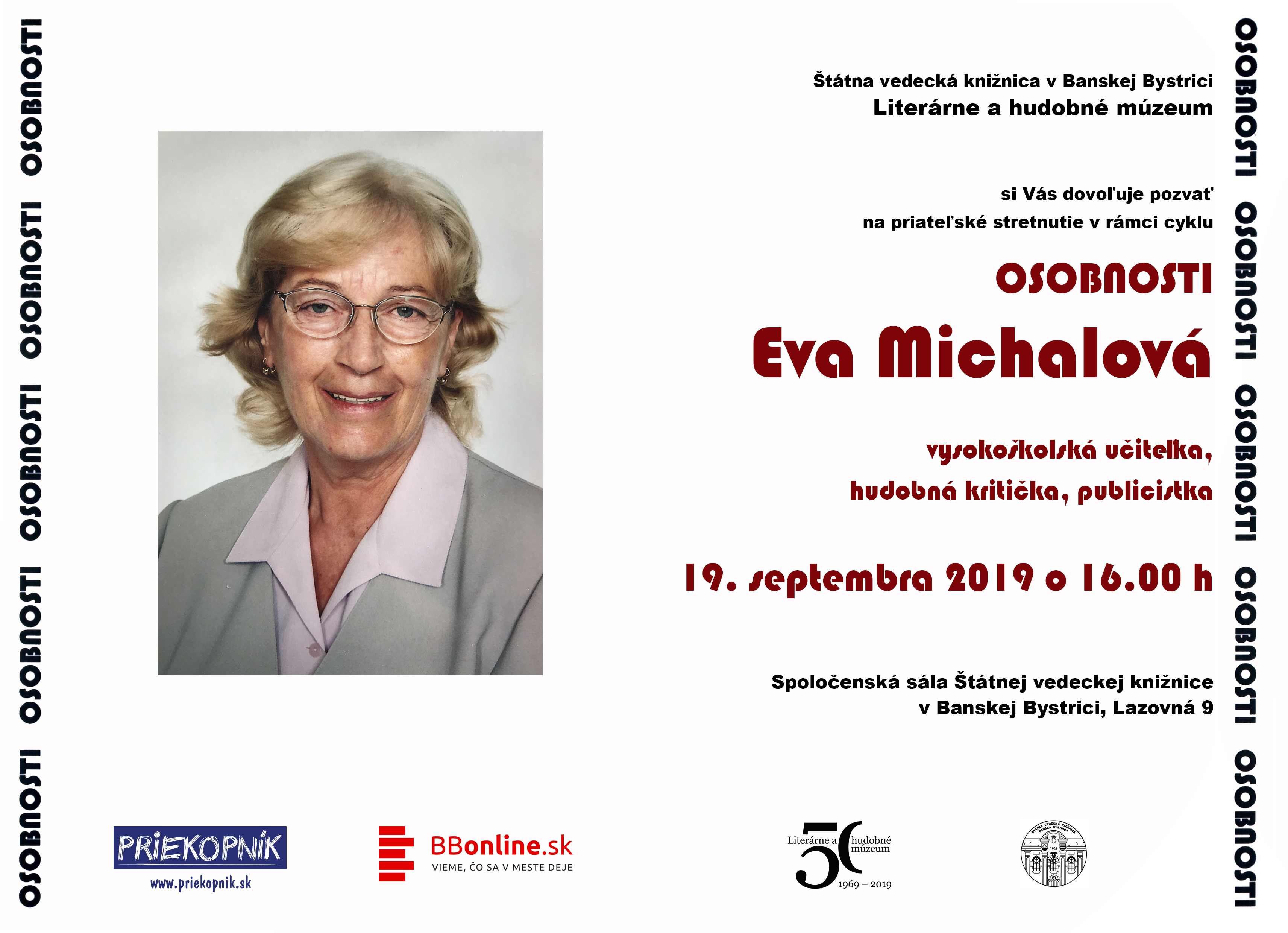 Literárne a hudobné múzeum si dovoľuje pozvať všetkých záujemcov na ďalšie podujatie z cyklu Osobnosti, ktoré bude venované vysokoškolskej učiteľke, hudobnej kritičke a publicistke Eve Michalovej.