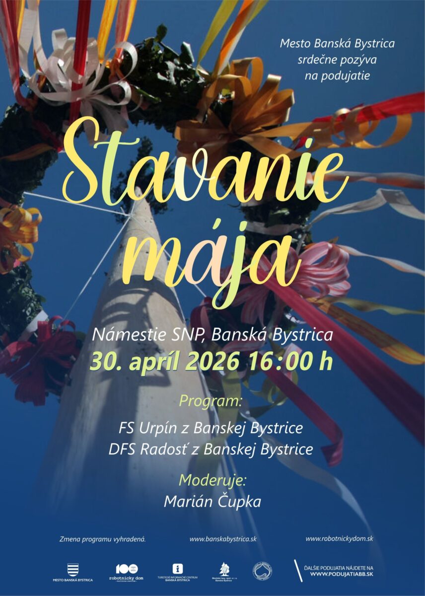Hoci kedysi stavali mládenci vysoké smreky a jedle pod okná svojich vyvolených, dnes sa tento zvyk sústreďuje aj do srdca mesta. Podujatie sa uskutoční 30. 4. 2026 o 16:00 na Námestí SNP.