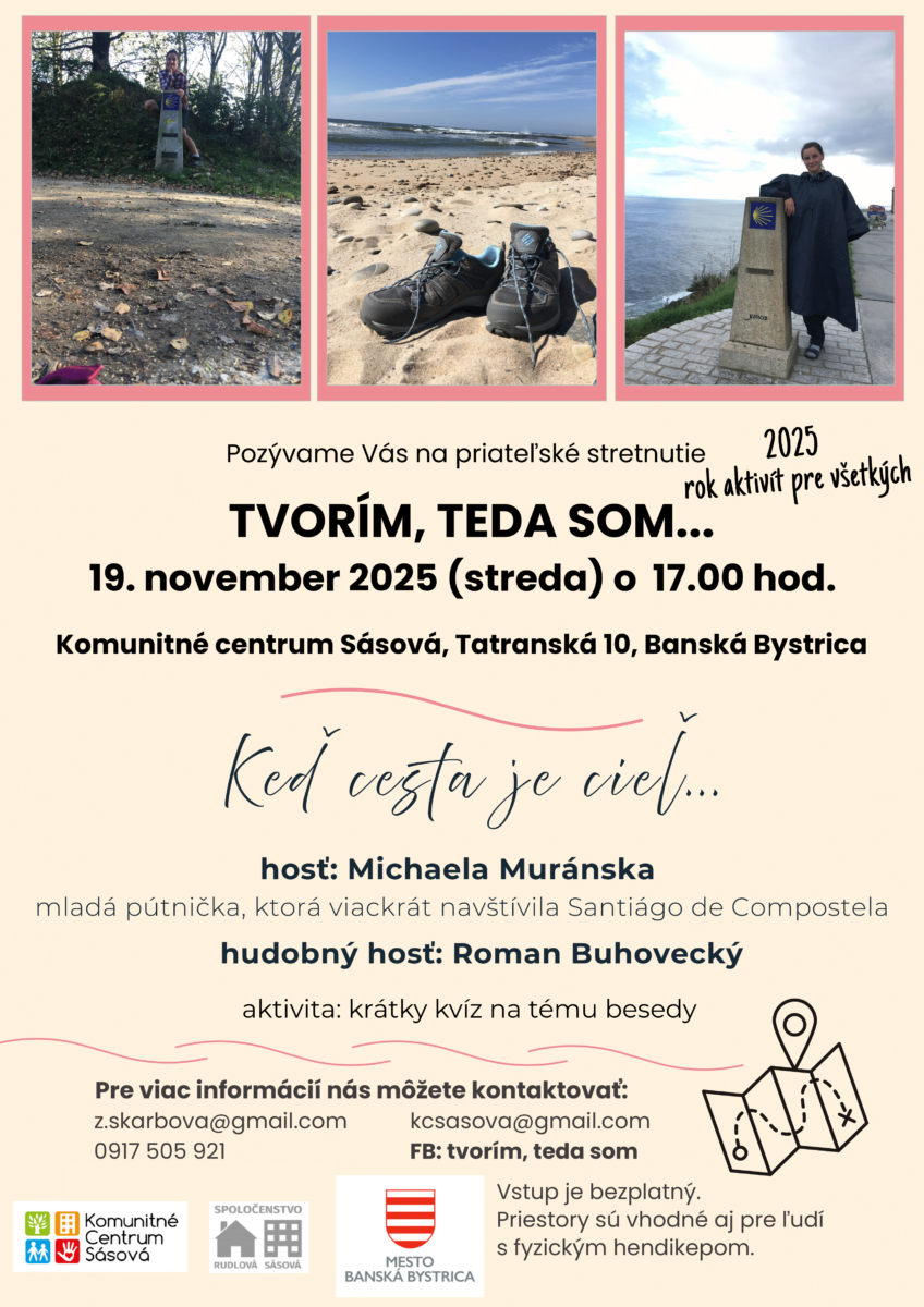 Pozývame vás do Komunitného centra Sásová, Tatranská 10 na ďalšie podujatie v rámci cyklu Tvorím, teda som, tentokrát na tému: Keď cesta je cieľ… S hosťom Michaelou Muránskou, ktorá niekoľkokrát absolvovala púť do Santiaga de Compostela sa na vás tešíme 19. novembra 2025 o 17:00 h. Hudobne bude podujatím sprevádzať Roman Bohuvecký a na záver bude pripravený krátky kvíz na tému besedy.