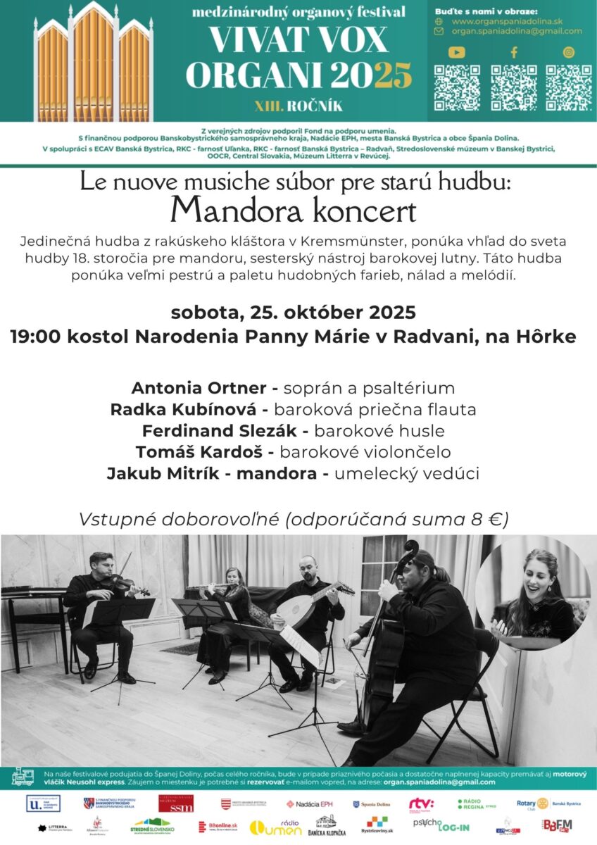 Jedinečná hudba z rakúskeho kláštora v Kremsmünster, ponúka vhľad do sveta hudby 18. storočia. Mandora, sesterský nástroj barokovej lutny, stojí dnes neprávom v tieni svojej slávnejšej sestry. Je to preto, že hudba písaná pre mandoru, sa zdá byť kompozične iná v porovnaní s hudbou rýdzeho baroka. Hudba písaná pre mandoru predstavuje prechod od baroka ku klasicizmu. Mandora bola súčasťou hudobného sveta až do zhruba prvej polovice 19. storočia. Táto hudba ponúka veľmi pestrú paletu hudobných farieb, nálad a melódií. V radvanskom kostole, na Hôrke, v sobotu 25. októbra 2025 o 19:00, uvedú koncert pre mandoru účinkujúci zo súboru pre starú hudbu Le nuove musiche: Antonia Ortner – soprán a psaltérium, Radka Kubínová – baroková priečna flauta, Ferdinand Slezák – barokové husle, Tomáš Kardoš – barokové violončelo a umelecký vedúci súboru Jakub Mitrík – mandora.