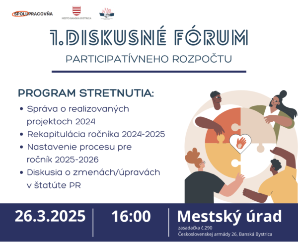Dňa 26.3.2025 sa v zasadačke č.290 na Mestskom úrade v Banskej Bystrici uskutočnilo 1. diskusné fórum participatívneho rozpočtu ročníka 2025/2026. Fórum bolo príležitosťou na zhodnotenie realizovaných projektov za rok 2024, rekapituláciu ročníka 2024/2025 a nastavenie procesov pre nadchádzajúci ročník 2025/2026. Účastníci sa aktívne zapojili do diskusie aj o možných zmenách a úpravách v štatúte participatívneho rozpočtu, s cieľom urobiť tento nástroj ešte efektívnejším a prístupnejším pre všetkých obyvateľov.
