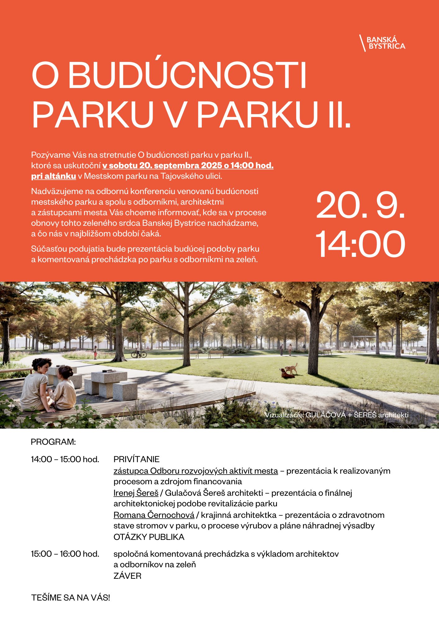 - Irenej Šereš / Gulačová Šereš architekti a krajinná architektka Romana Černochová – prezentácia o finálnej architektonickej podobe revitalizácie parku a o zdravotnom stave stromov v parku, o procese výrubov a pláne náhradnej výsadby